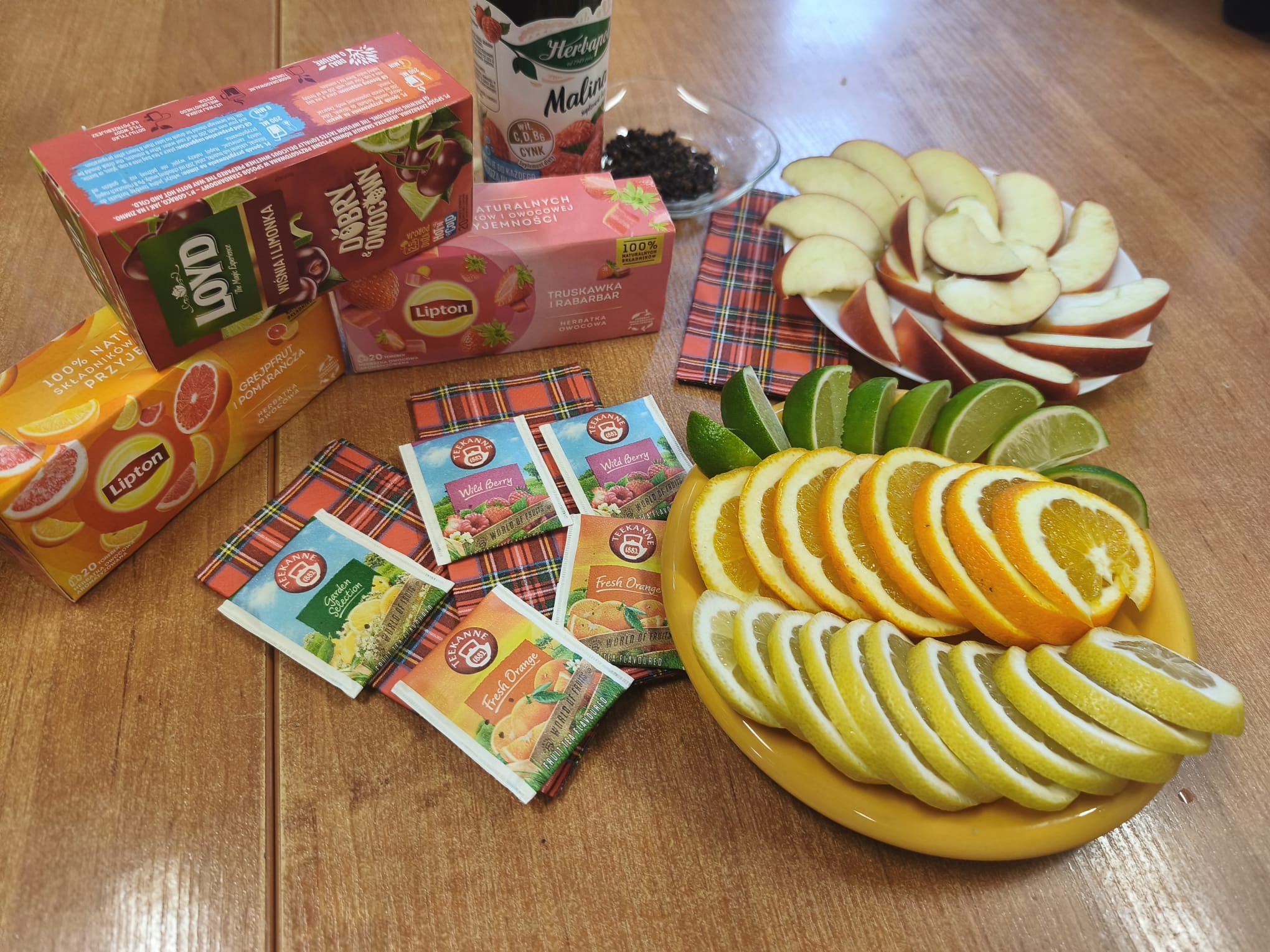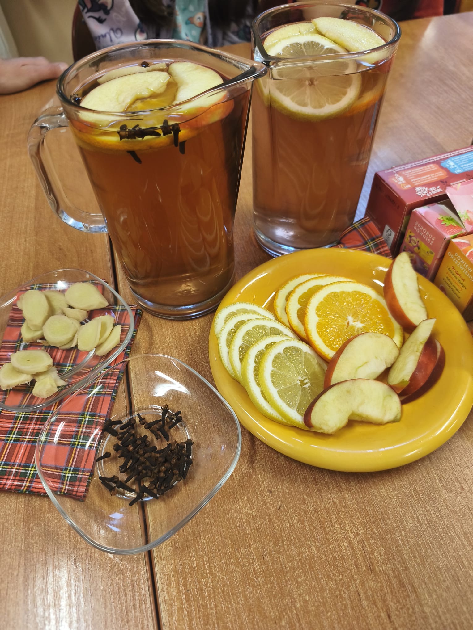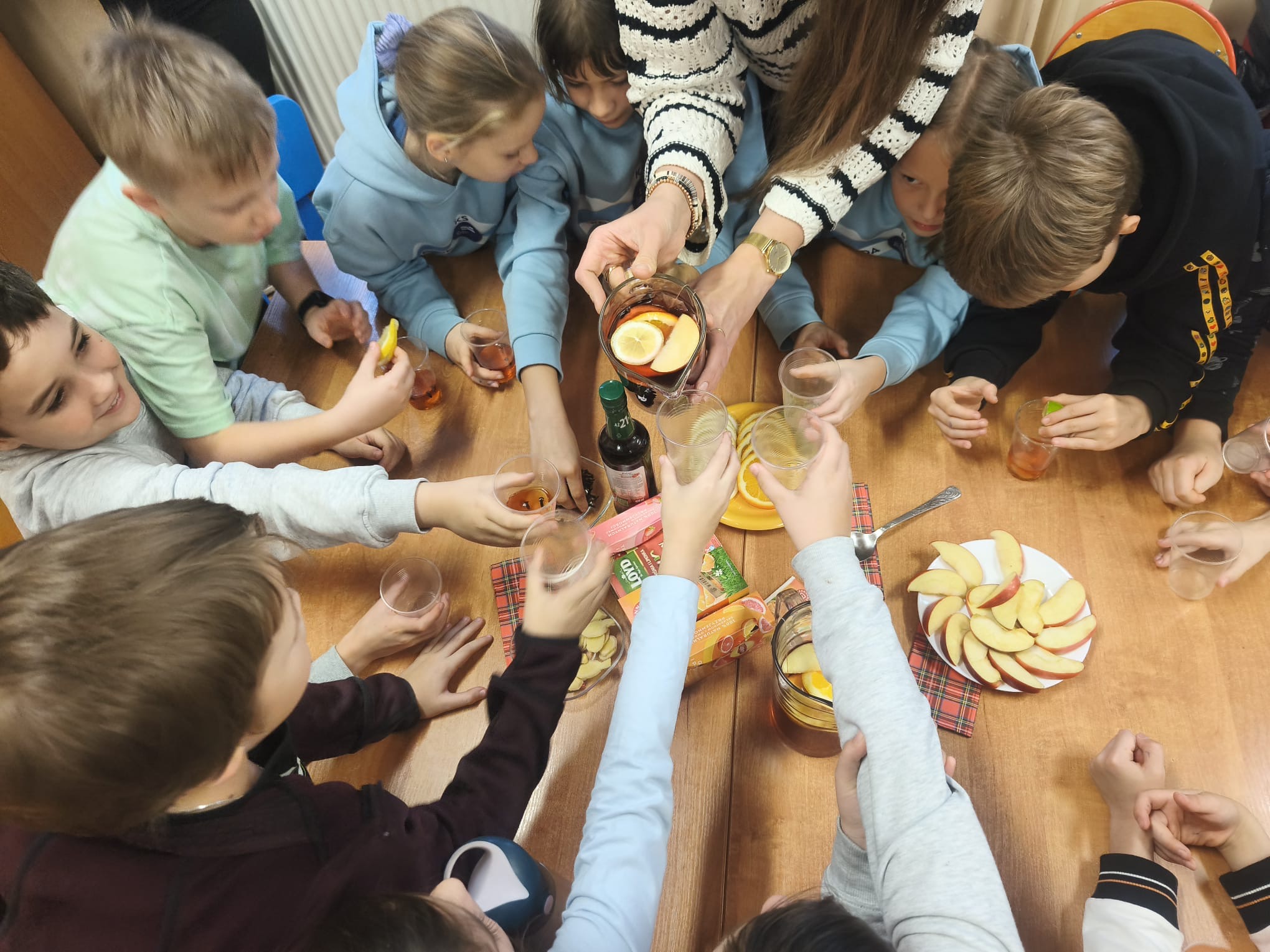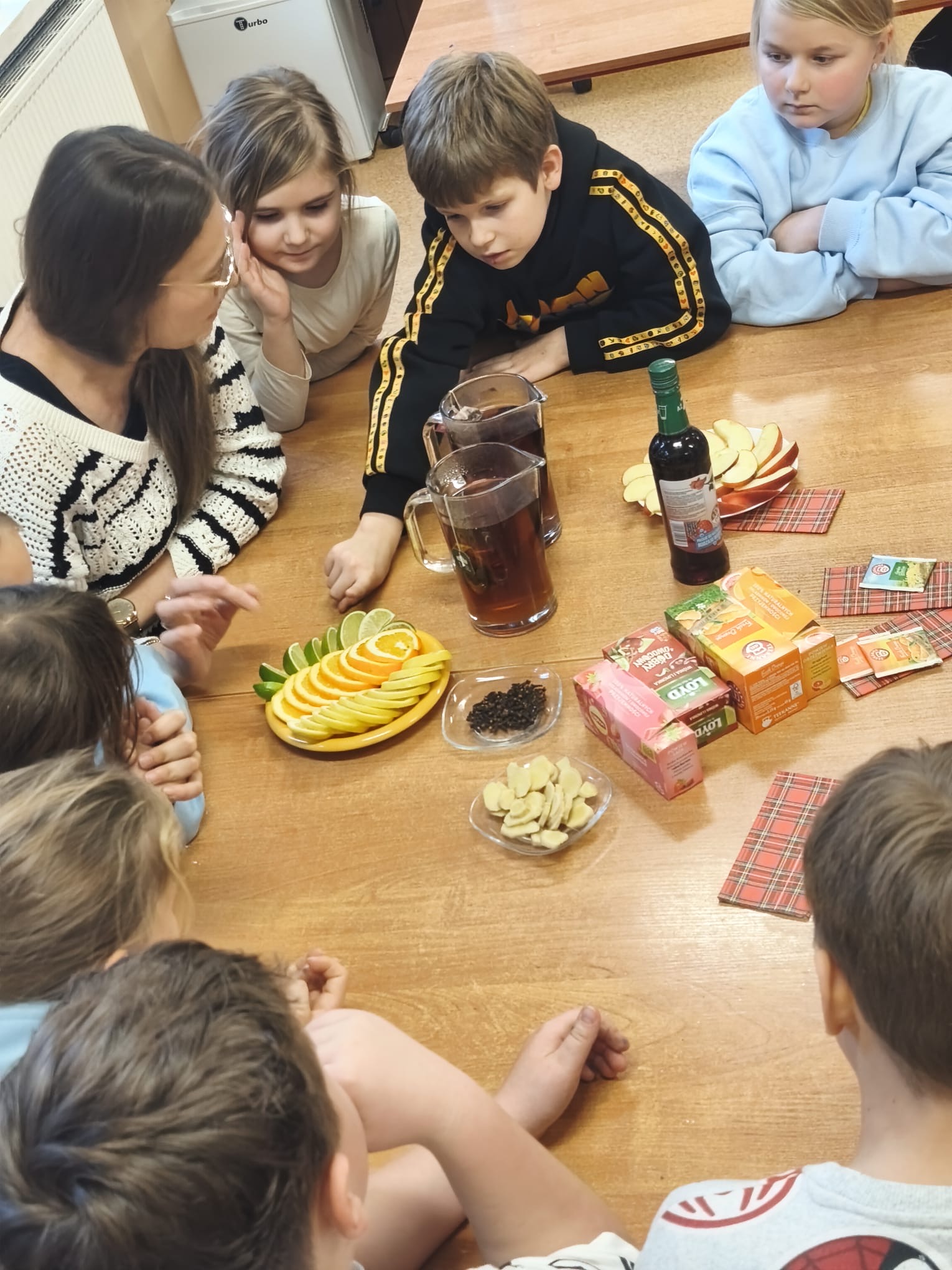 Podczas zajęć dzieci samodzielnie komponowały zimową herbatę, dobierając różnorodne dodatki, tj. owoce, przyprawy korzenne czy syrop malinowy. Uczniowie z dużym zaangażowaniem eksperymentowali z zapachami i smakami, tworząc własne, autorskie kompozycje.