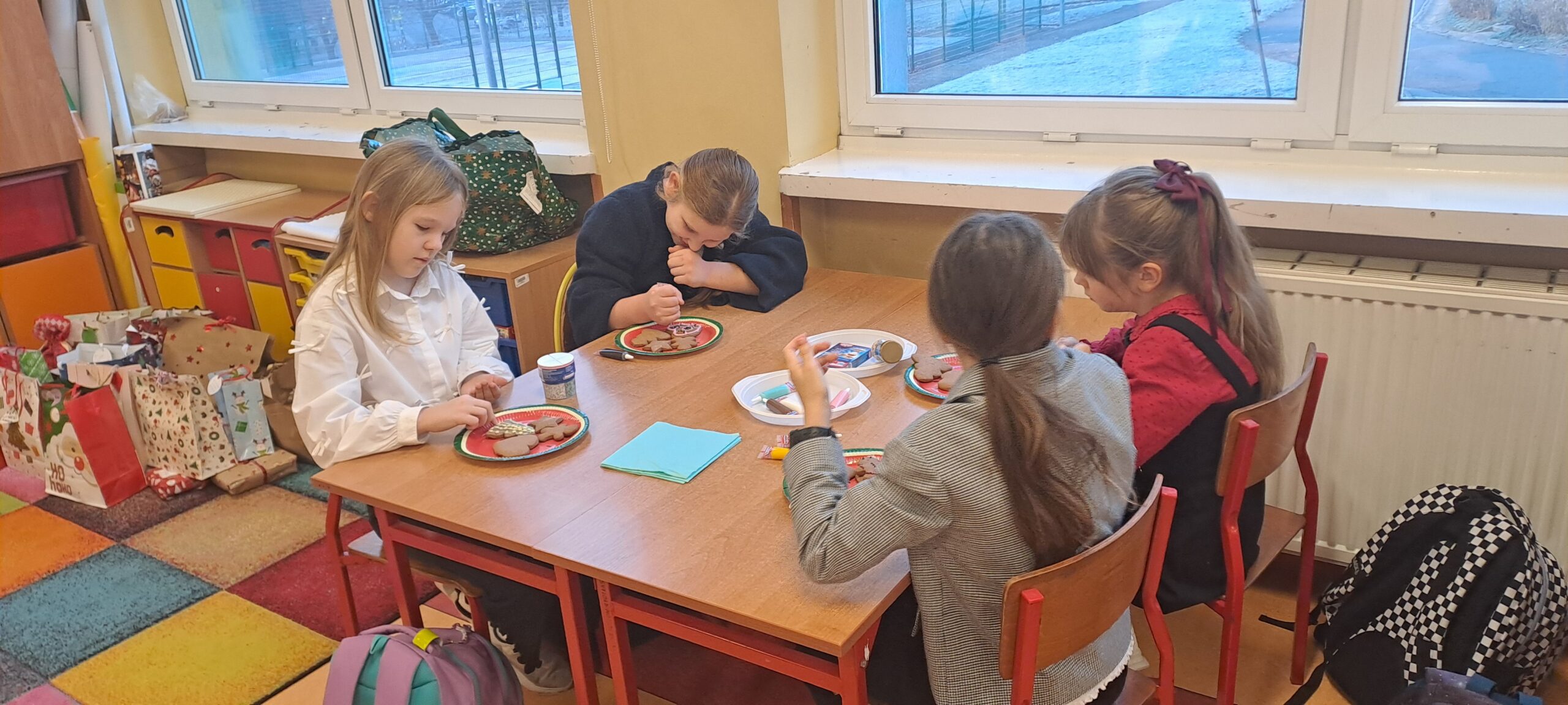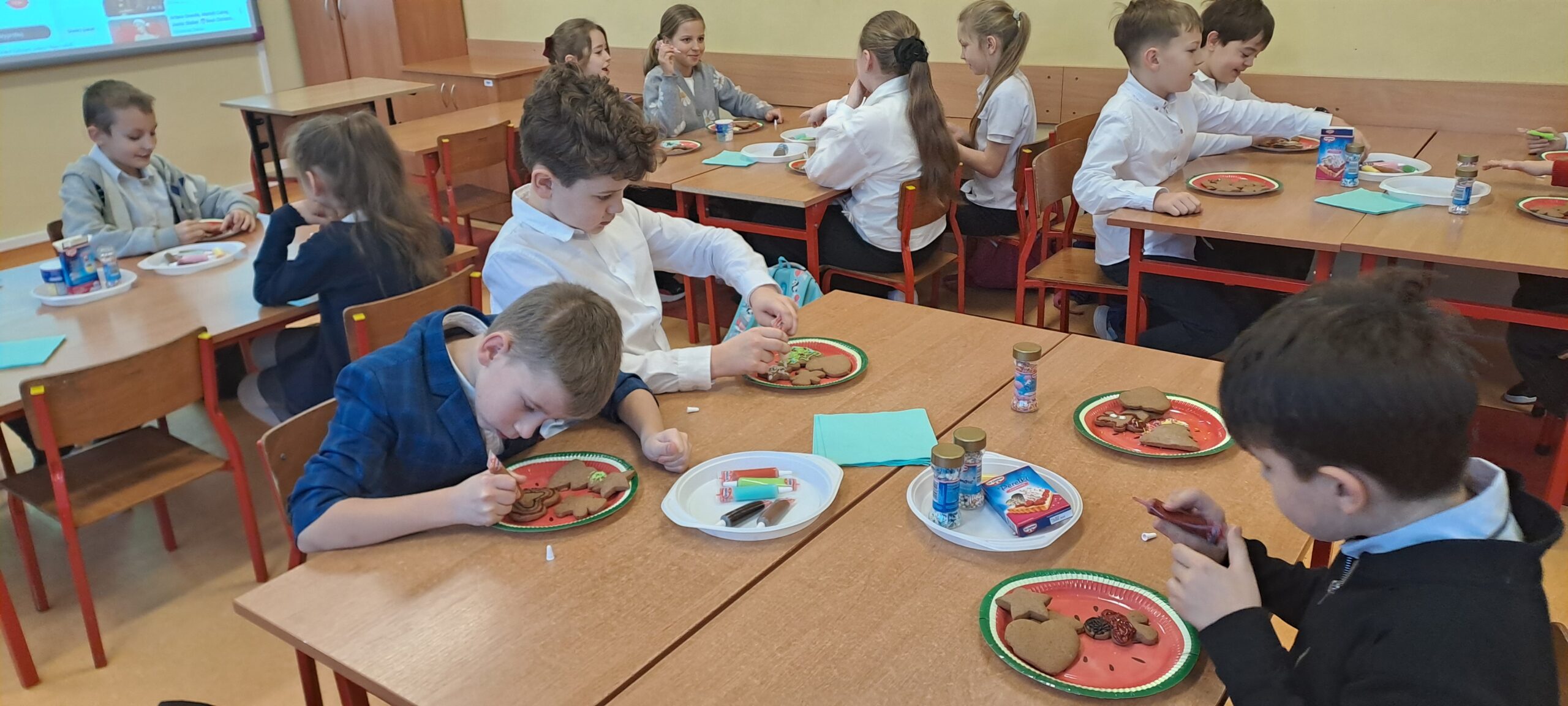 Tuż przed świętami uczniowie klasy 3b wzięli udział w wyjątkowych warsztatach zdobienia pierniczków. Na stołach pojawiły się kolorowe posypki i pisaki, a dzieci z ogromnym zaangażowaniem tworzyły swoje małe dzieła sztuki.