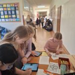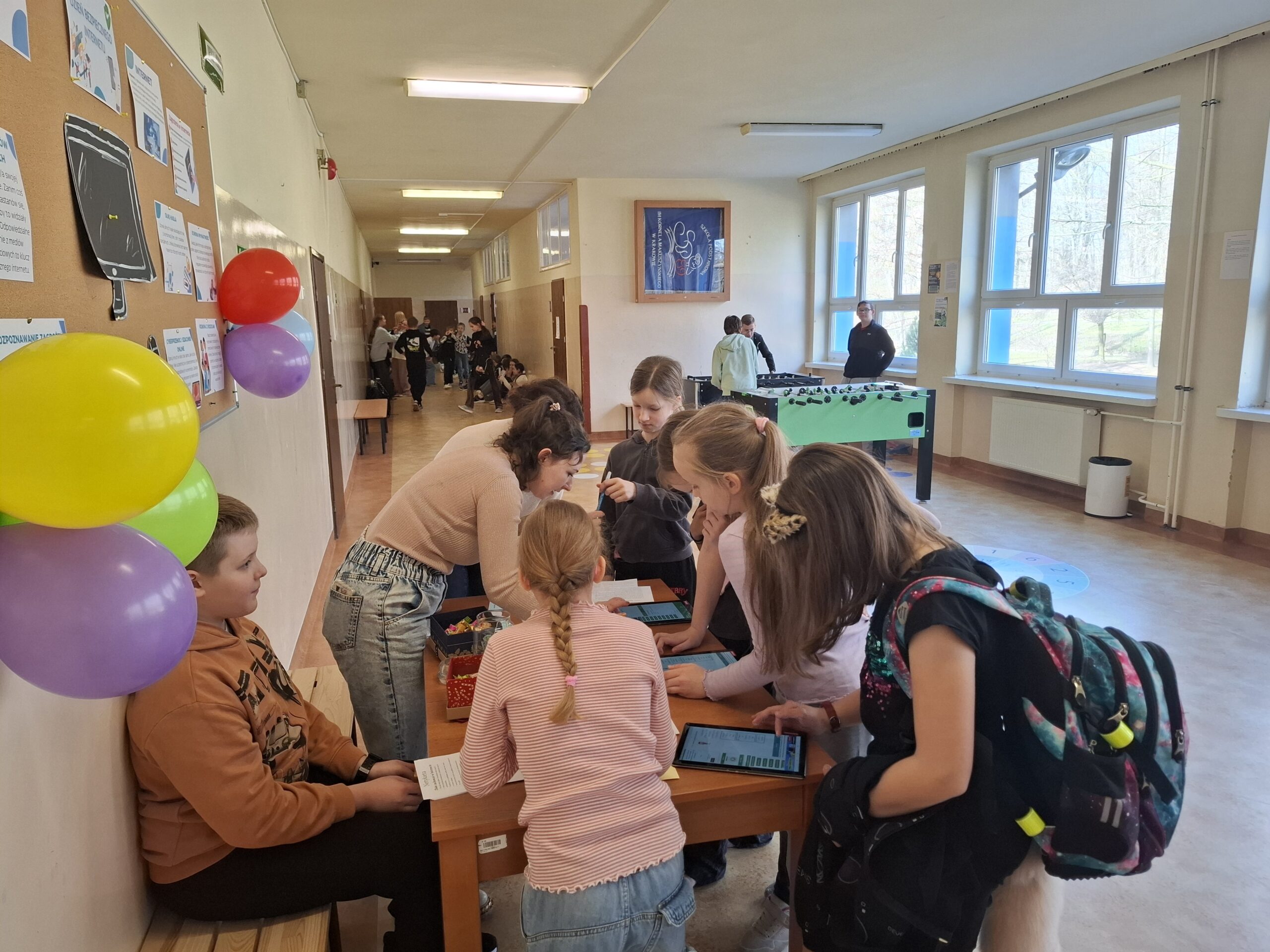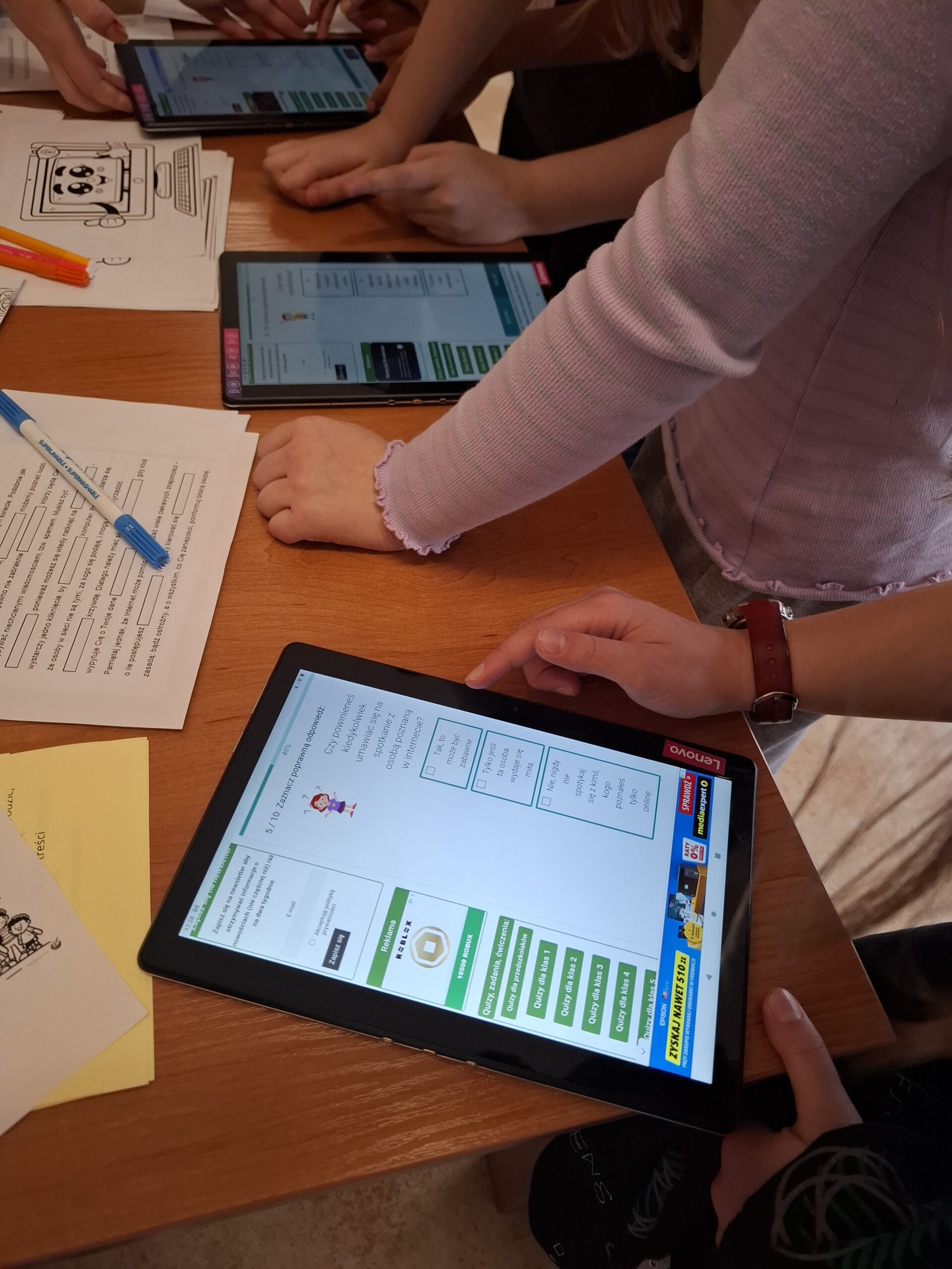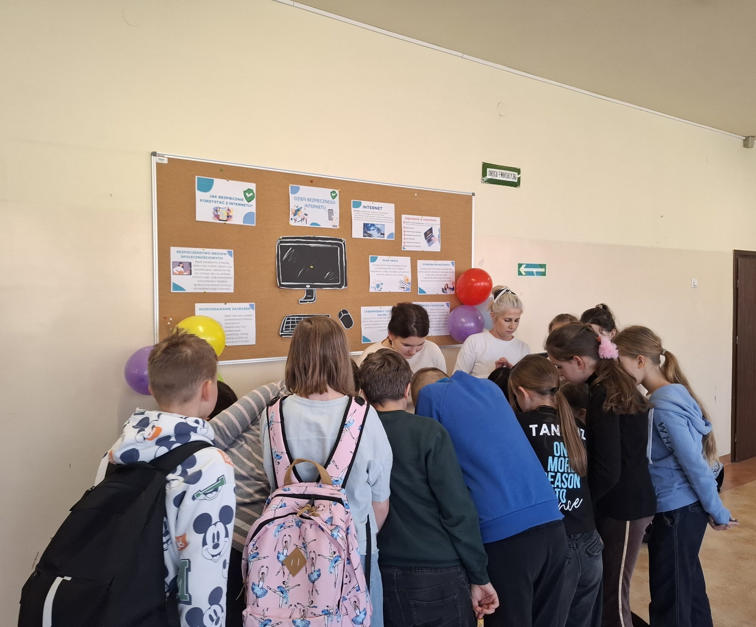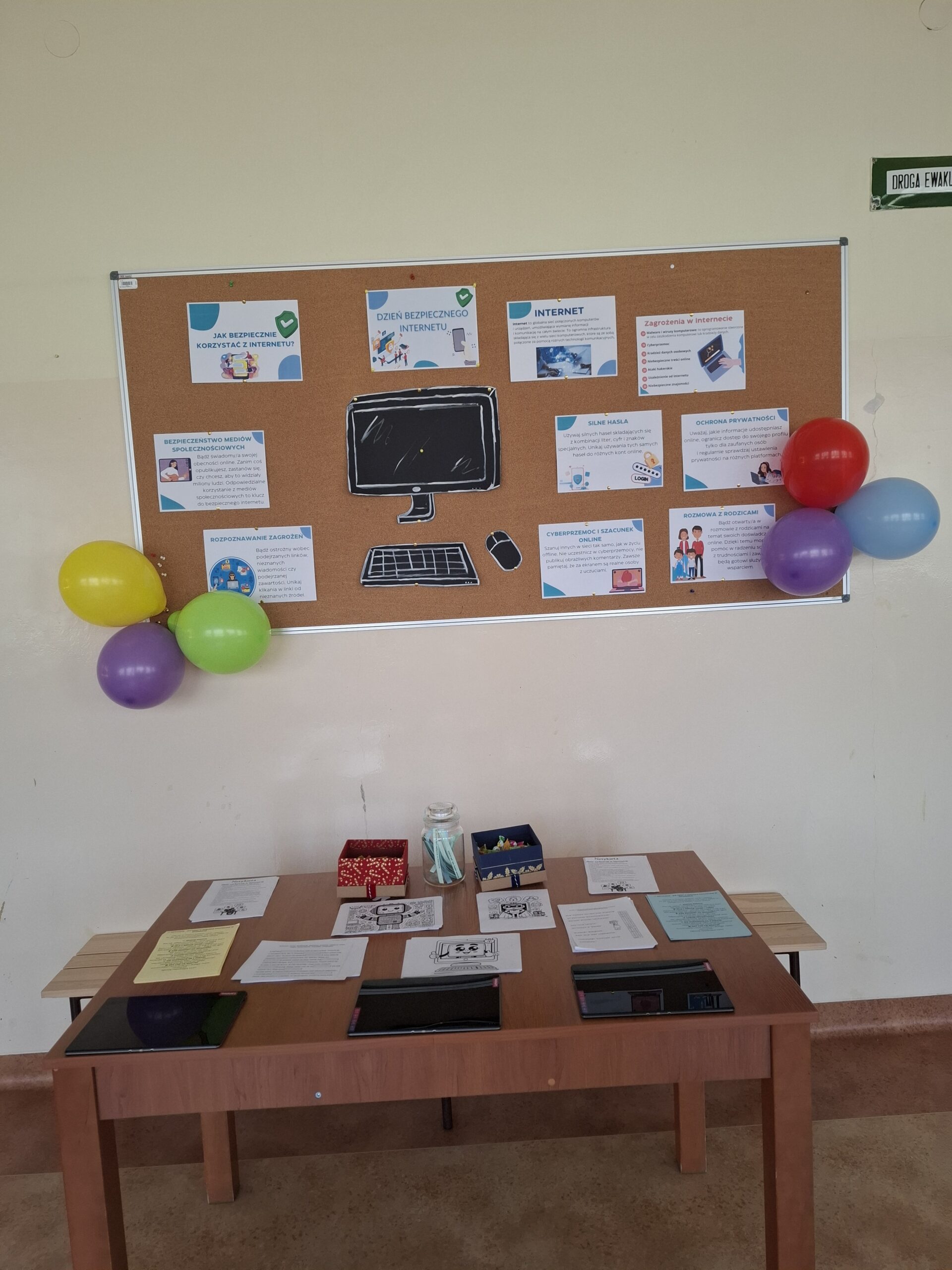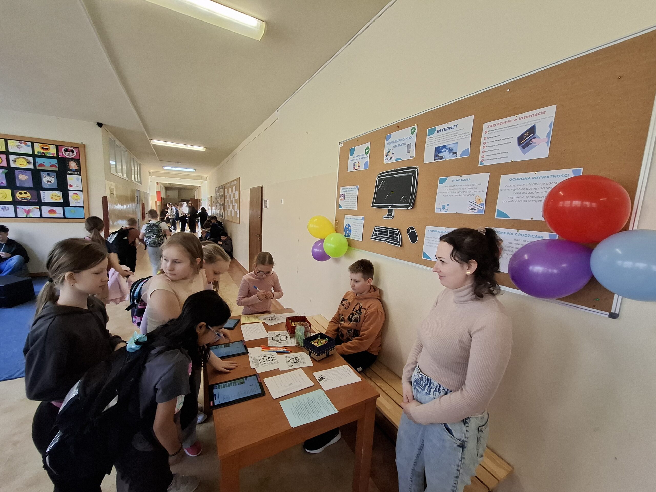Uczniowie mogli rozwiązać quiz na tablecie, wykonać przygotowane zadania oraz pokolorować tematyczne ilustracje. Za aktywny udział otrzymali słodki upominek i broszurkę z zasadami bezpiecznego korzystania z internetu.