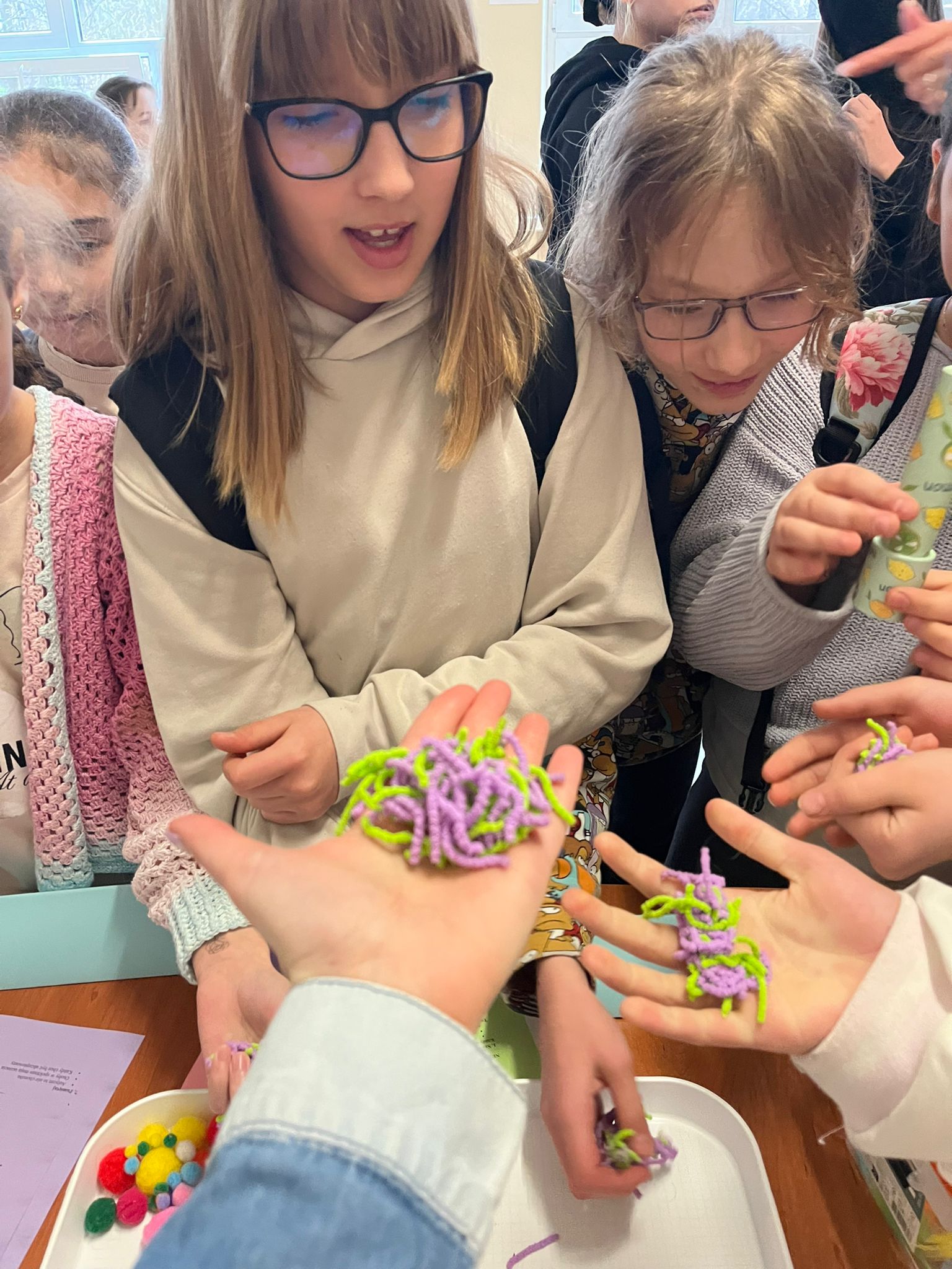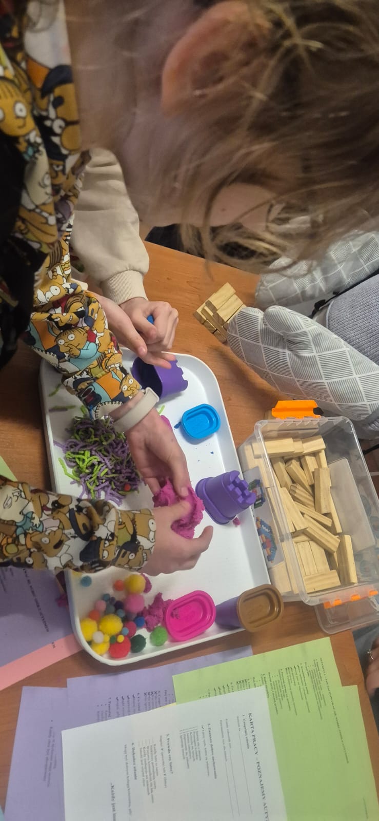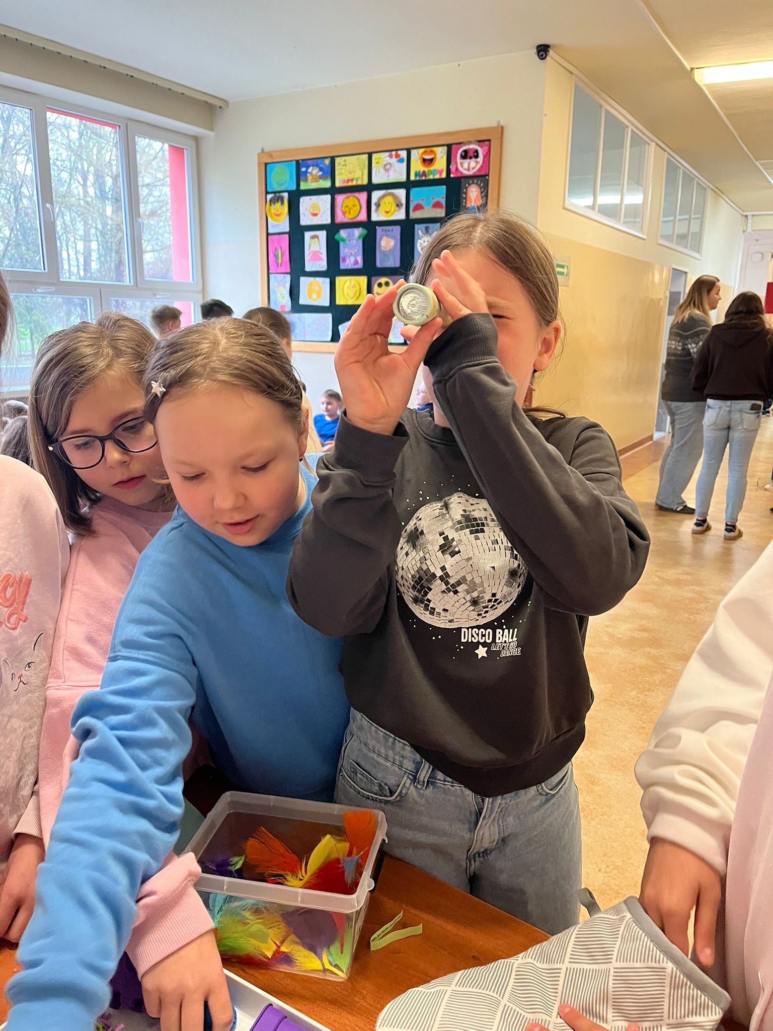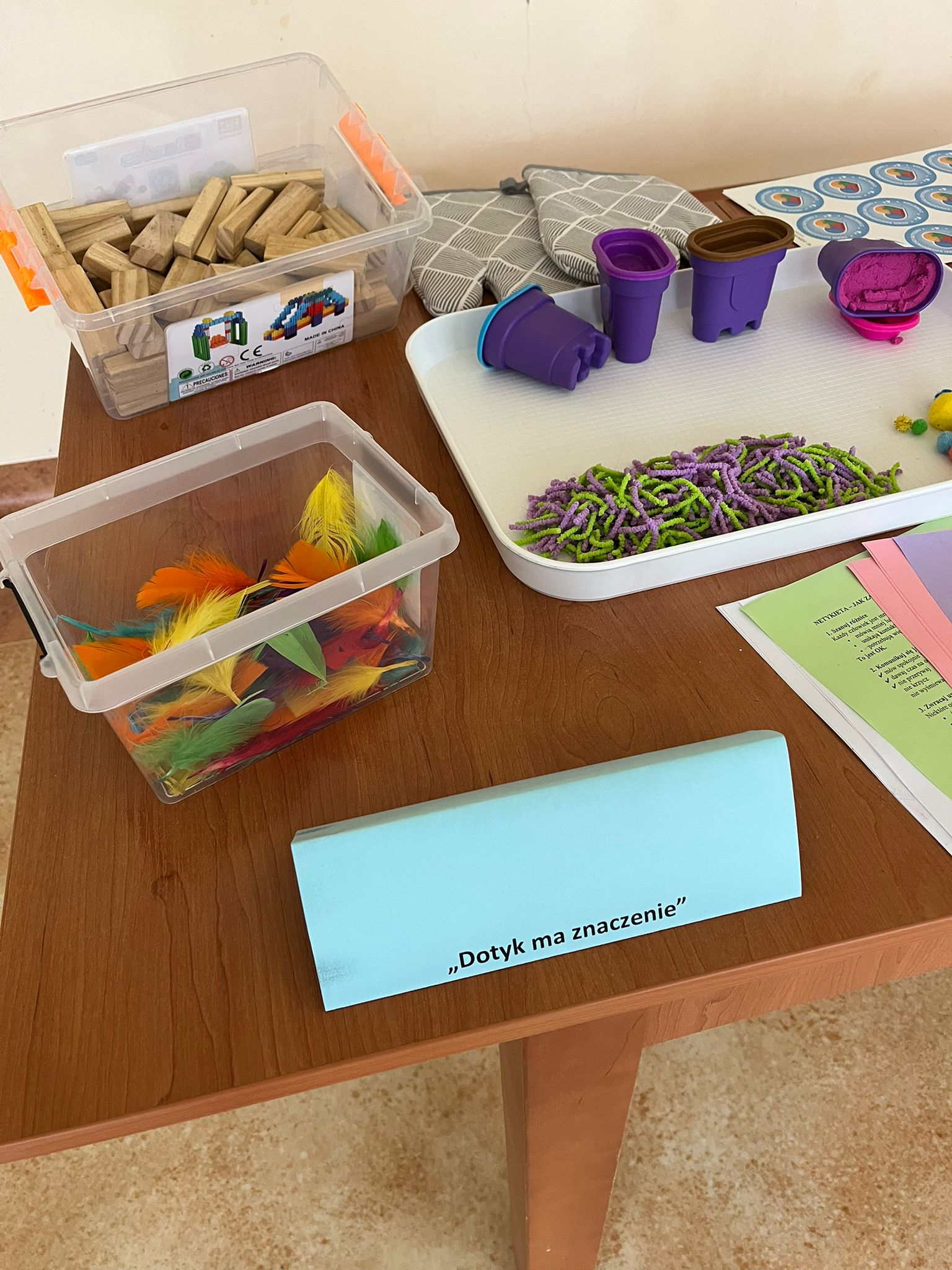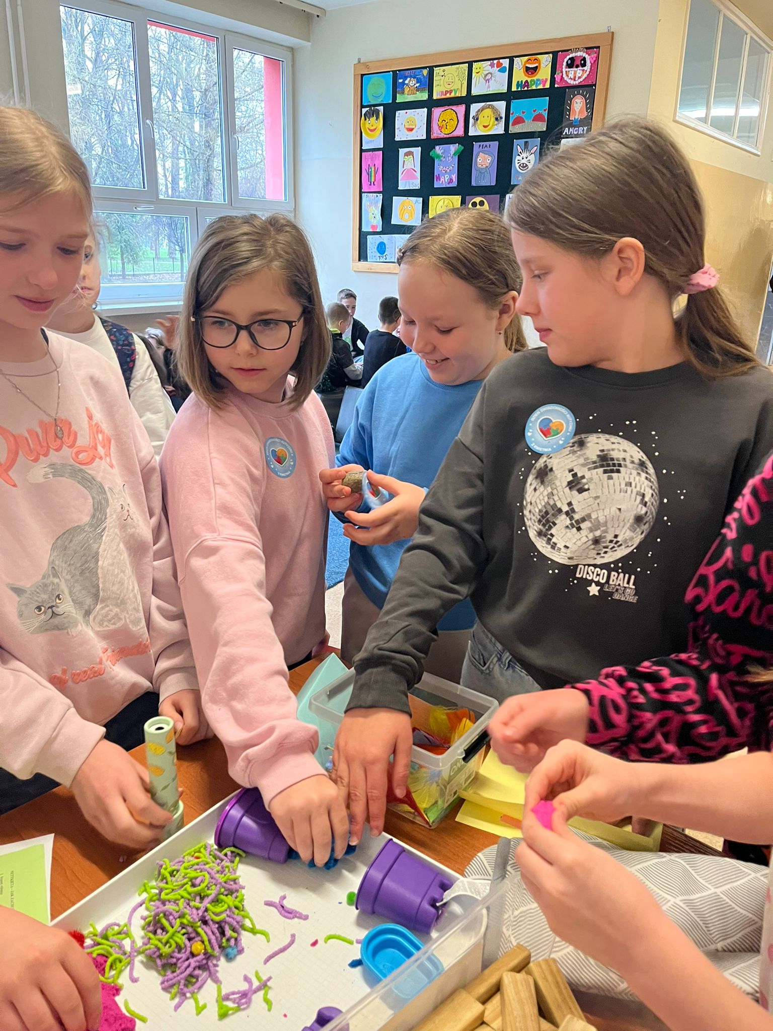 W ramach akcji zorganizowano stoisko sensoryczne, na którym uczniowie mieli okazję poznawać różne zmysły poprzez praktyczne doświadczenia. Mogli m.in. odkrywać zmysł dotyku, korzystając z różnych materiałów, takich jak piórka, piasek kinetyczny czy inne faktury, a także rozwijać zmysł wzroku poprzez zabawę z kalejdoskopem oraz wyszukiwanie przedmiotów na obrazkach.